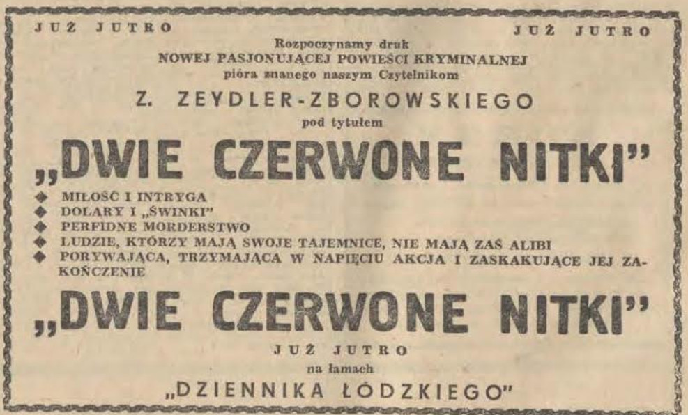 Dokonałem pewnego odkrycia w myśl zasady „szukajta a znajdzieta”. „Czerwona nitka” była drukowana w „Dzienniku Łódzkim” pod o wiele bardziej właściwym tytułem „Dwie czerwone nitki”; miało to miejsce w okresie od 28 września do 23 grudnia 1969 roku w numerach 231 – 304. A co ciekawe następnego dnia, w numerze świątecznym „Dziennik Łódzki zaczął publikację kolejnej książki ZZZ „Nawet umarli kłamią” – i to ma sens, Franciszek Kociuba jest już po szkole oficerskiej w Szczytnie; tymczasem w wydaniach książkowych tej logicznej kolejności brakuje. I w ten sposób dołożyłem swoją cegiełkę do działu „Gazetowce”, bo tam „Czerwonej nitki” nie ma. A oto dowód na to, że nie kręcę:
